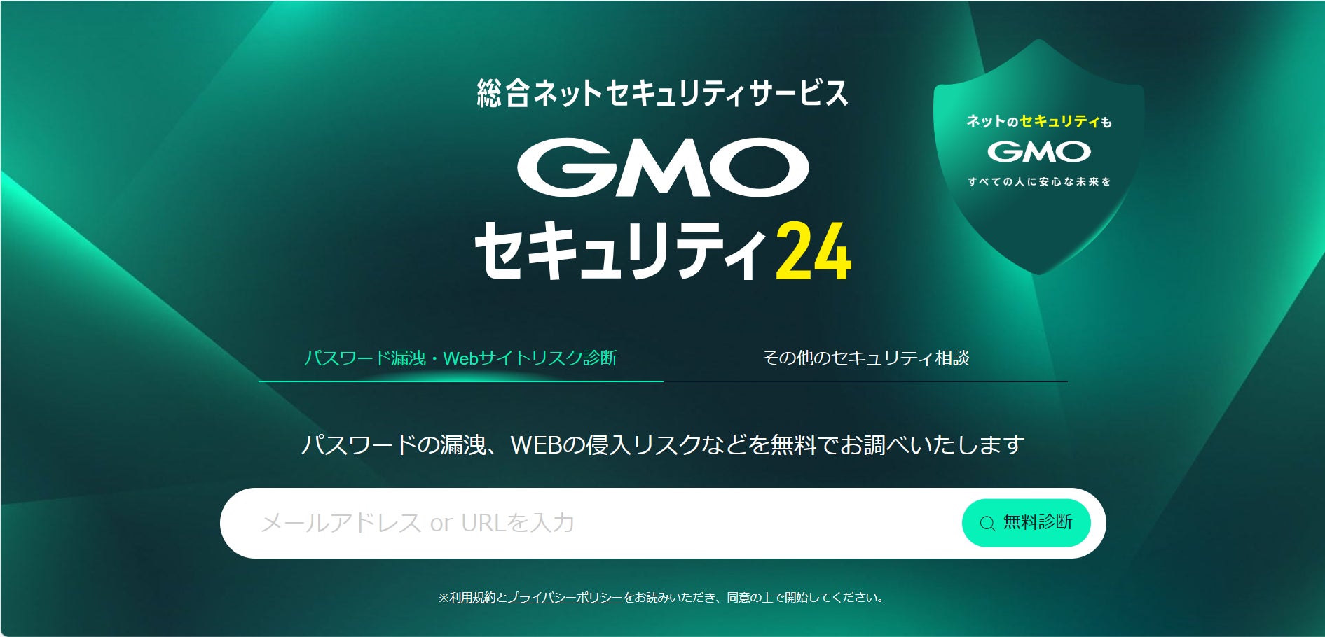 「GMOセキュリティ24」は、GMOインターネットグループによる新プロジェクト「ネットのセキュリティもGMO」の第1弾として、2025年2月6日(木)に提供を開始した、世界初となる24時間無料で使える総合ネットセキュリティ・サービスです。本サービスでは、「①パスワード漏洩診断」「②Webサイトリスク診断」「③セキュリティ相談AIチャットボット」の3つの機能を備えており、すべてのお客様に無料でご利用いただけます。
