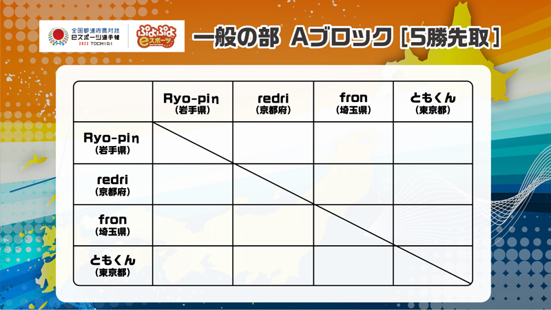 本大会は「小学生の部」「一般の部」それぞれ、出場選手をA・B・C・Dの4つのブロックに分け、ブロックごとにリーグ戦を行い、各ブロック上位1名が決勝トーナメントに進出します。決勝トーナメントはシングルイリミネーション方式で行われ、1回戦の組み合わせはAブロックの1位・Bブロックの1位、Cブロックの1位・Dブロックの1位となります。そして決勝トーナメントで1位となった選手がぷよぷよの日本一「全国都道府県対抗eスポーツ選手権 2022 TOCHIGI ぷよぷよ部門」の優勝選手となります。