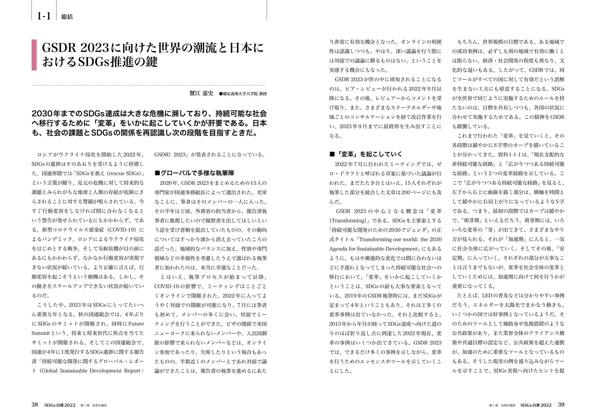 来る2023年にはSDGsの取り組みが折り返し地点を迎え、国連による「持続可能な開発に関するグローバル・レポート(GSDR)2023」が公開される予定です。その執筆中の科学者のメッセージも掲載している本白書は、民間企業、NPO/NGO、ユース、教育機関、行政など、あらゆるセクターでSDGsの推進に取り組まれる方々にとって、日本の現状を知るための最適な資料となっています。