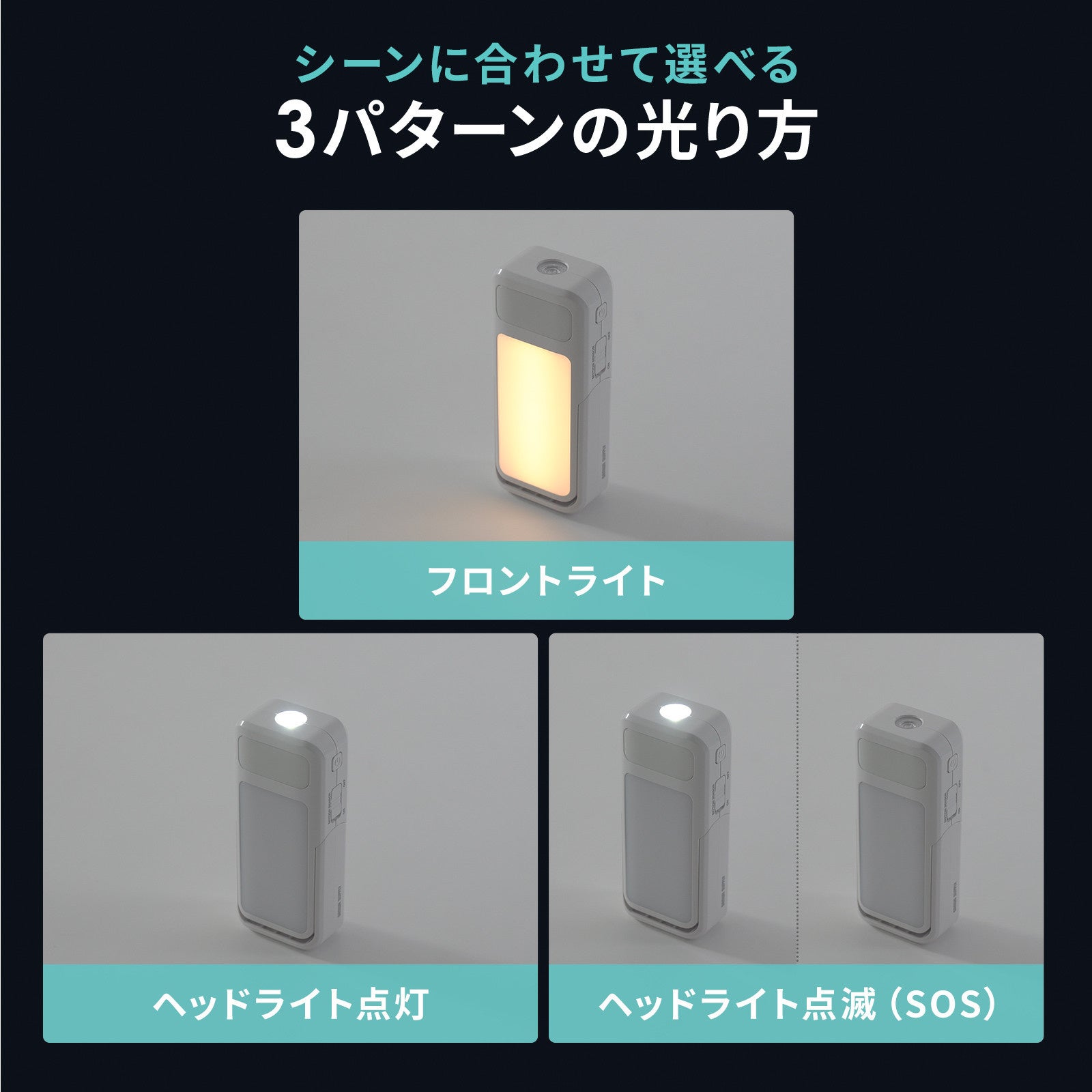 シーンに合わせて光り方を3パターン(フロントライト・ヘッドライト点灯・ヘッドライト点滅)から選べます。