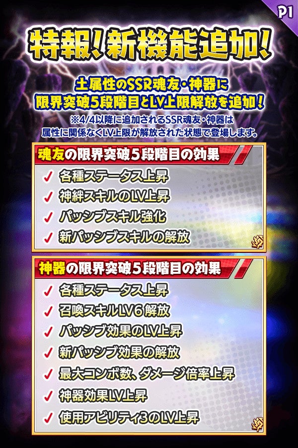 また、土属性のLV上限解放記念として、土属性魂友5段階目の限界突破に必要なアイテムを4月4日(木)メンテナンス後にユーザーの皆様にプレゼントいたします。ぜひこの機会に魂友を強化してみてください!