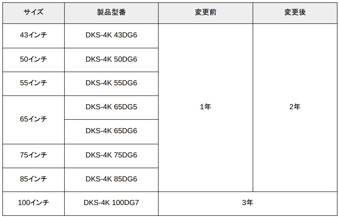 この度、DMM.make 4K DISPLAYシリーズをより多くのお客様に安心してご使用いただくため、保証期間を1年間から2年へ延長することを決定しました。すでにご購入いただきましたお客様には、ご購入日より下記期間の保証対応をさせていただきます。今後もより多くのお客様に長く安心して製品をご使用いただける様、サポート体制のさらなる充実を目指してまいります。