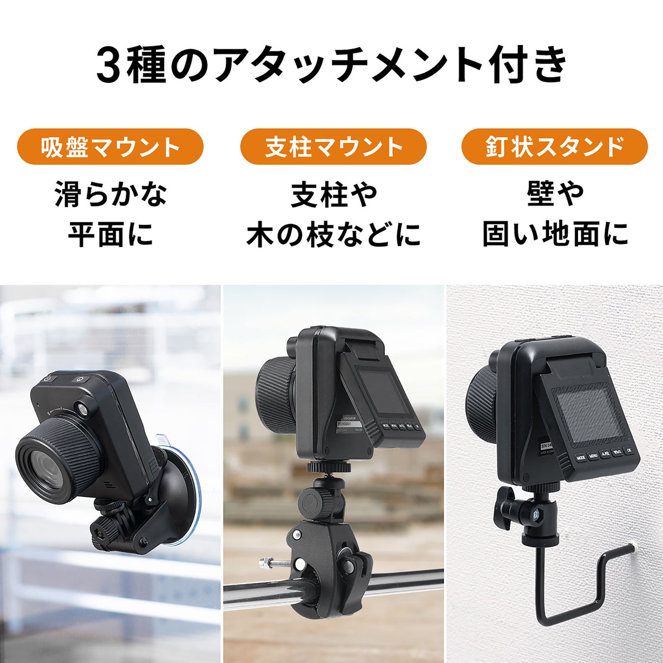 吸盤マウント、支柱マウント、カメラマウント+釘状スタンドの3種のアタッチメント付きなので、様々な場所や用途に合わせてご利用いただけます。