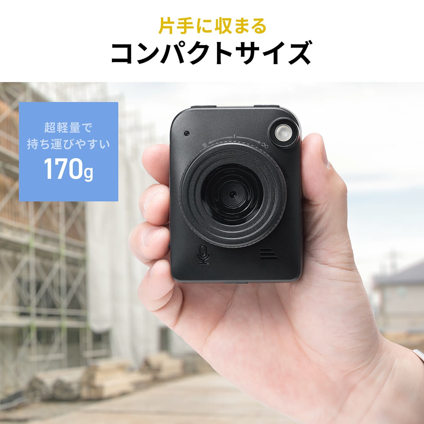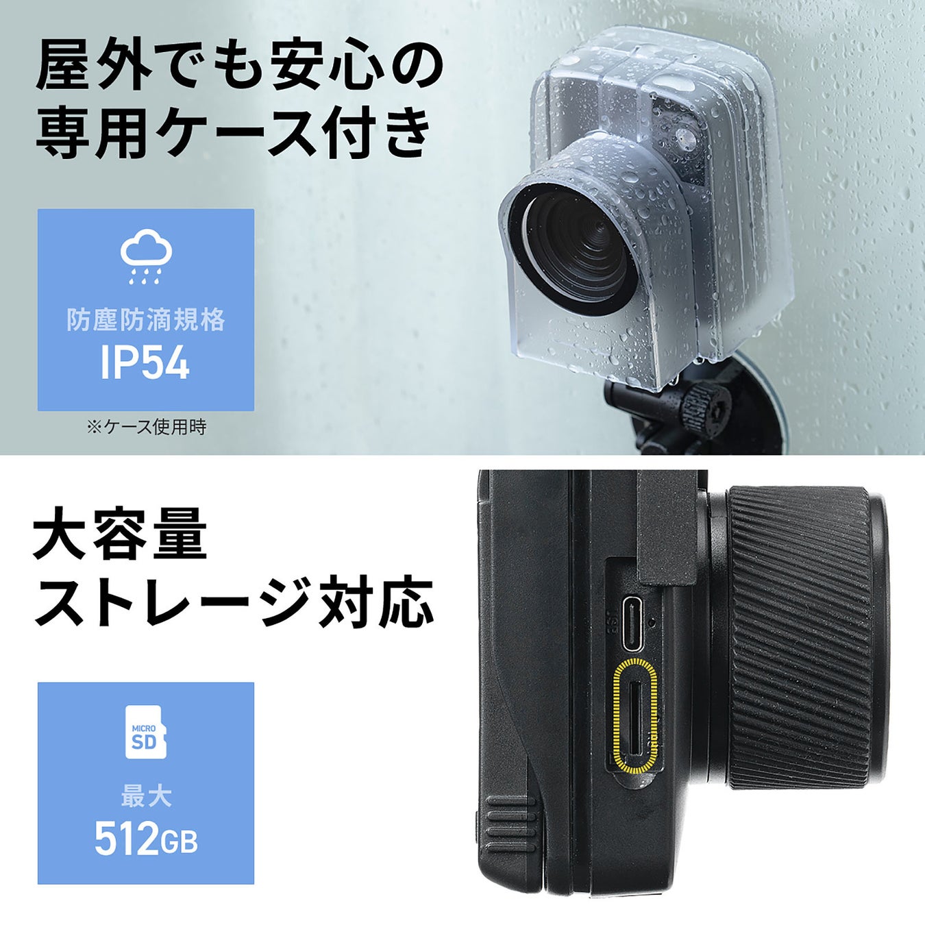 専用ケースが付属しており、雨や汚れからカメラを保護します。これにより、屋外での使用や厳しい環境下での撮影にも安心してご利用いただけます。低照度でも明るく撮影できる高感度センサーを採用し、僅かな光でも明るく撮影できるので、夜間や暗い場所での撮影もクリアに記録できます。