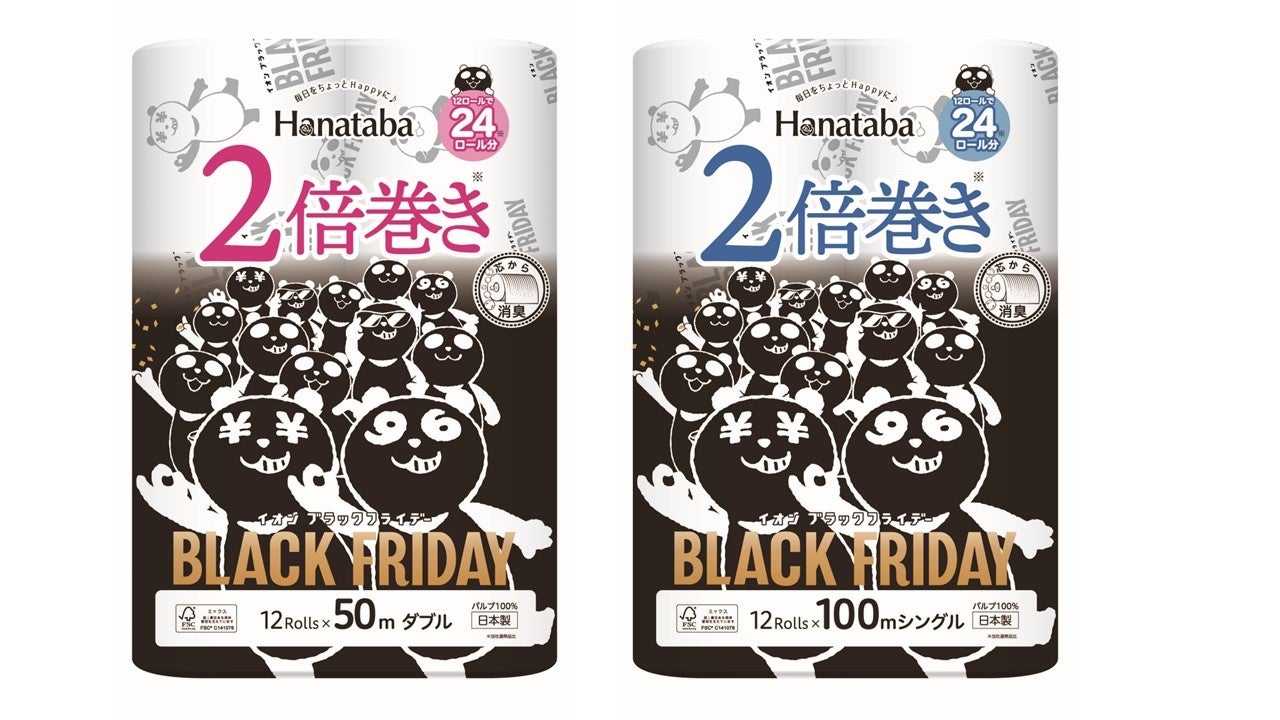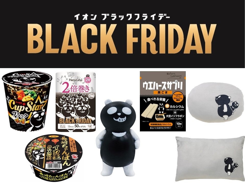 イオンリテールは11月22日(金)~12月1日(日)※1)の「イオン ブラックフライデー」期間中、「イオン」「イオンスタイル」等約380店舗※2)にて、カップ麺やトイレットペーパー、クッションなど、ブラックパンダデザインのイオン限定商品約80品目を販売します。