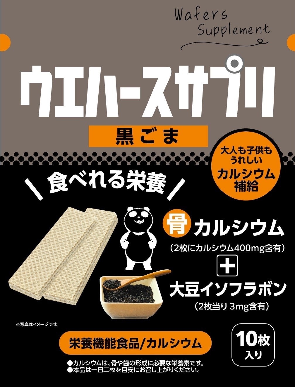 大人も子どもも気軽にカルシウムや大豆イソフラボンを補給できる栄養機能食品のウエハースです。ブラックフライデーをイメージして黒ごま味をブラックパンダデザインパッケージで展開します。