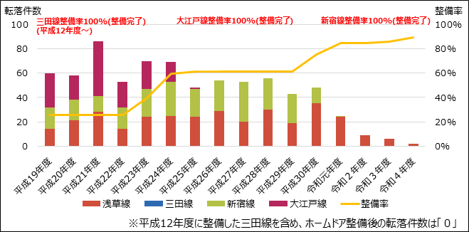 整備後の路線では転落件数が「0」となるなど、ホーム上の安全対策として高い効果を発揮しています。交通局では、今後も更なる安全対策に取り組み、誰もが安全・安心に利用できる都営地下鉄を実現してまいります。