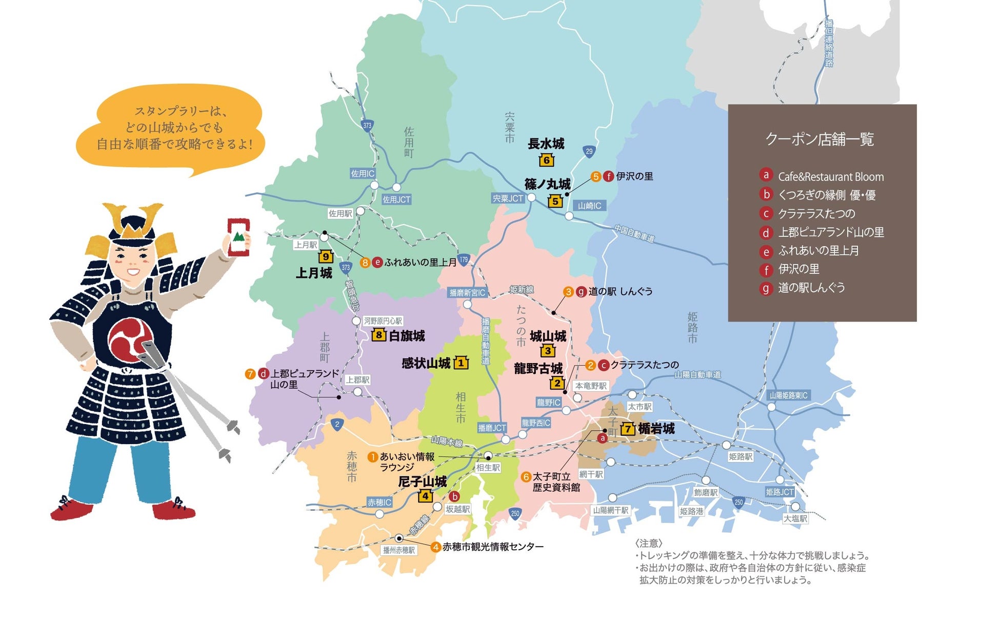 中国地方から近畿地方への西の玄関口である兵庫県西播磨地域には、国指定史跡「利神城」「感状山城」「白旗城」をはじめ130以上の山城があり、歴史上多くの武将たちが山城を拠点に覇権を争ってきました。500年以上の時を経て、現在は絶景を望める展望スポットや紅葉の美しい森として親しまれていますが、歴史に目を向けると、残された石垣や堀から武将の知恵や戦場の熱気が伝わってきます。乱世に生きた武将たちの痕跡が残る西播磨の山城をスタンプラリーで巡って、歴史を追体験してみませんか。