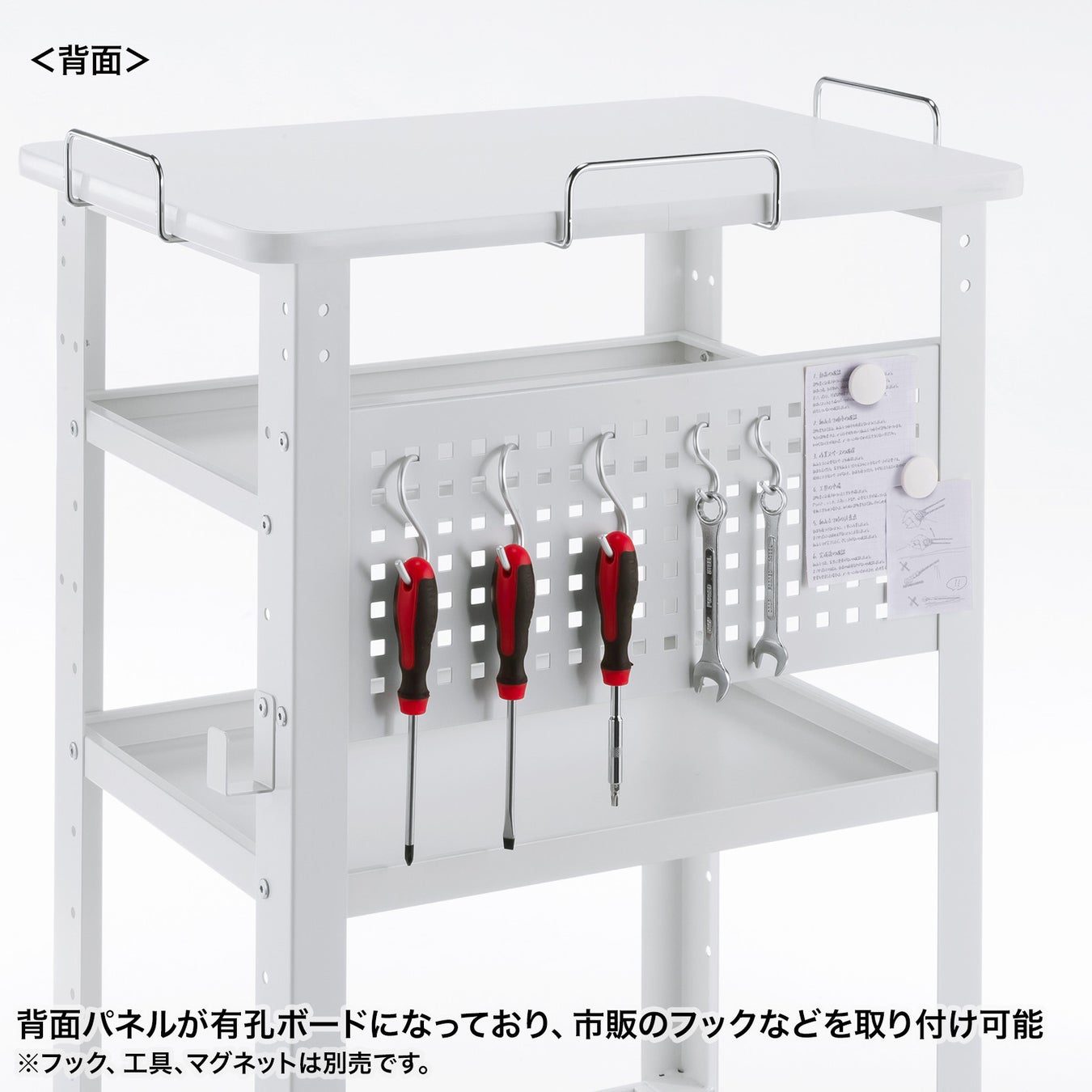 背面パネルが有孔ボードになっており、市販のフックなどが取り付け可能で壁面収納を増やすことができます。