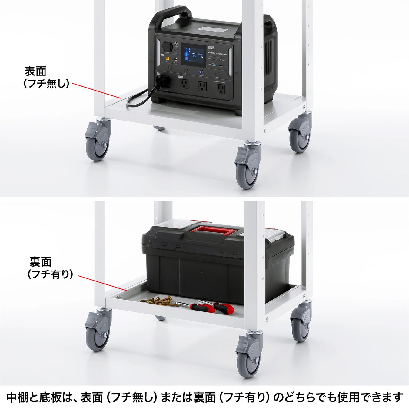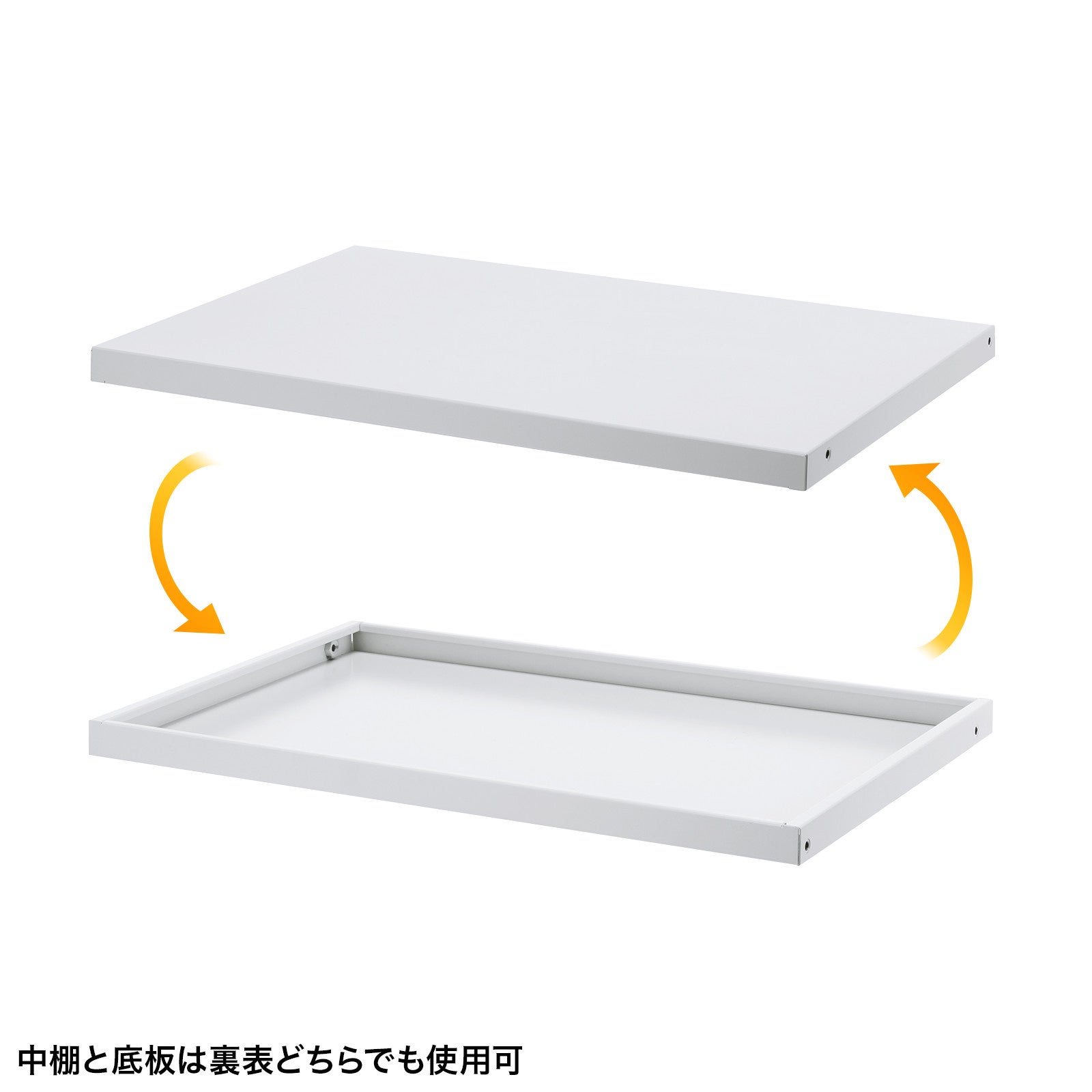 中棚と底板は、組み立て時にフチなしの棚、またはフチありのトレイ状に設定可能です。用途に合わせて設定できます。