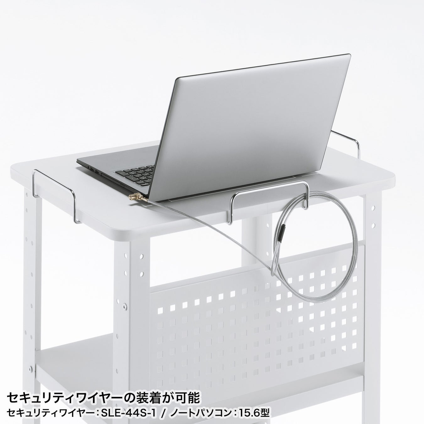 天板には落下防止用のガード付きです。また、ガード部分にセキュリティワイヤーの取り付けが可能で、機器を落下や盗難から守ります。