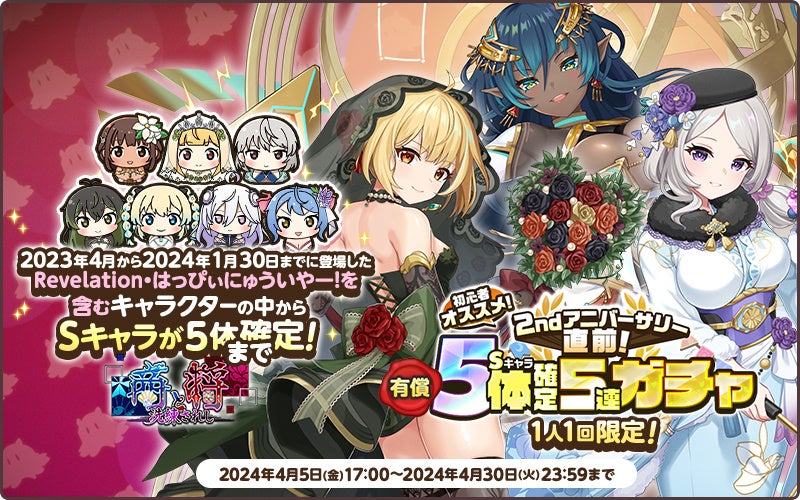 2024年4月5日(金)17:00より2ndアニバーサリー直前!初心者オススメ!S5体確定5連ガチャが開催中です。2023年4月から2024年1月30日までに登場したキャラの中から、Sキャラが5体まで確定で出現します!