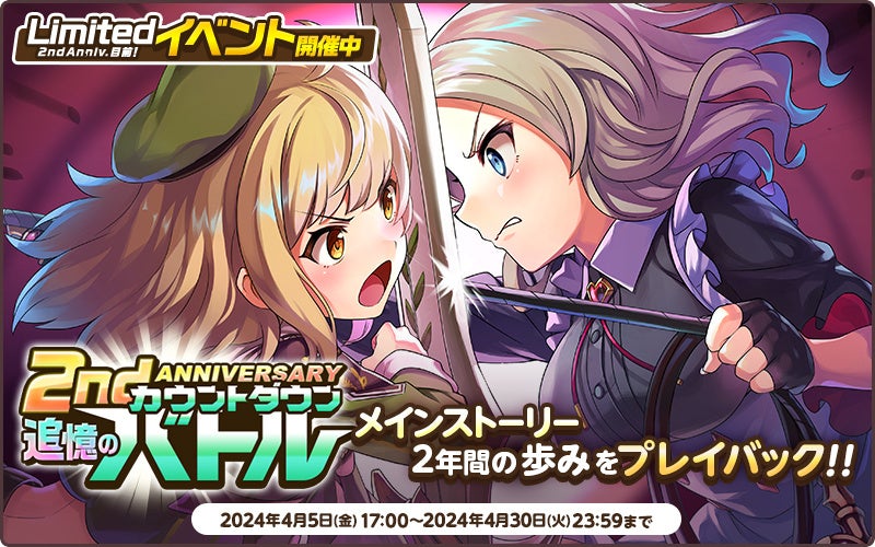 2024年4月5日(金)より2ndアニバーサリー直前Limitedイベント『追憶のカウントダウンバトル』が開催中!2年間のメインストーリーを振り返る特別シナリオ(全8話)も閲覧できます。