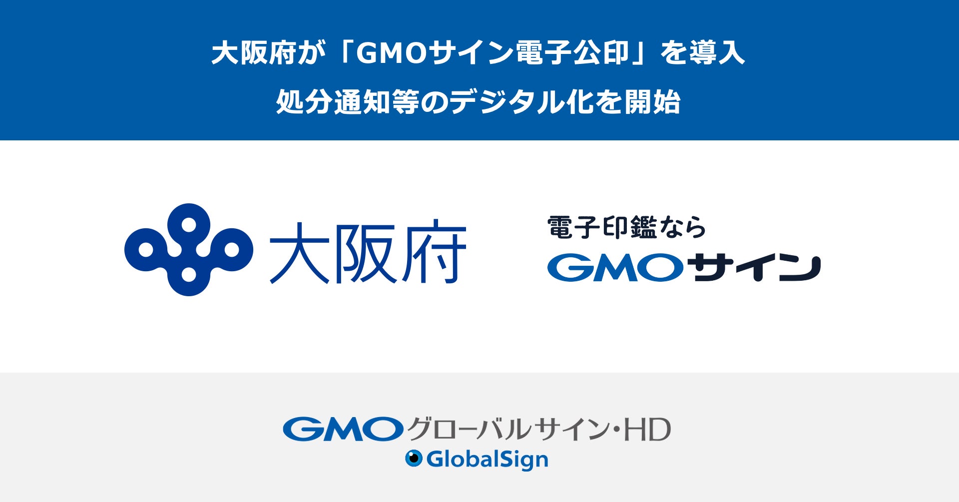 GMOグローバルサイン・ホールディングス株式会社(代表取締役社⻑:⻘⼭ 満 以下、GMOグローバルサイン・HD)は、自社が開発・運営する行政の処分通知等を電子化するサービス「GMOサイン電子公印」を、大阪府(知事:吉村 洋文 以下、大阪府)に導入したことをお知らせいたします。