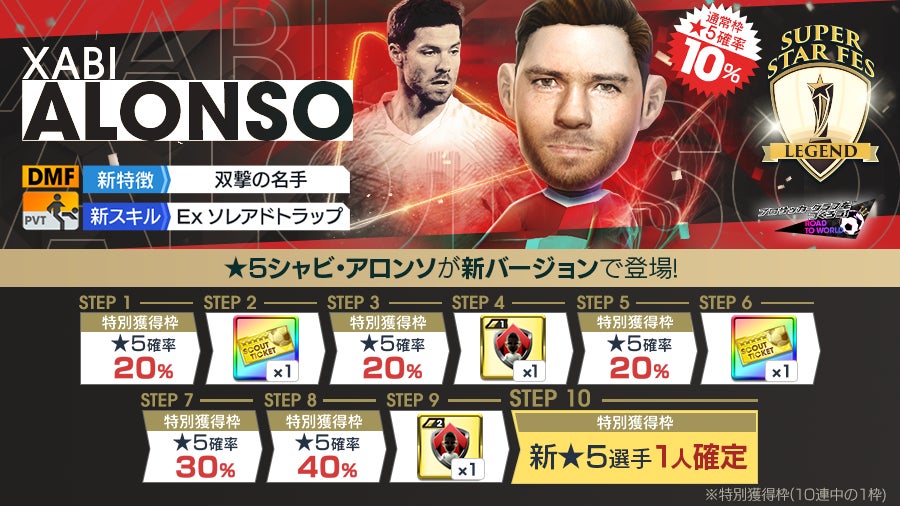 今回の“SUPER STAR FES LEGEND”では、スペインリーグのレジェンド「シャビ・アロンソ」や現役のスーパースターたちが、得意戦術「中央突破」の新★5選手として登場します。