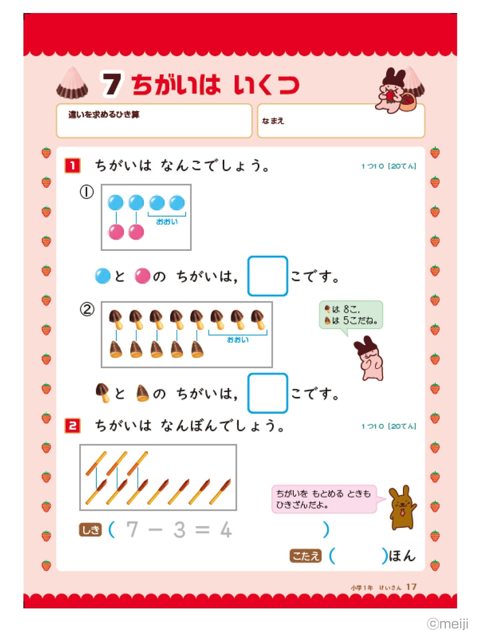 問題の題材に、普段食べているおかしが登場するので、興味をもって取り組むことができます。
