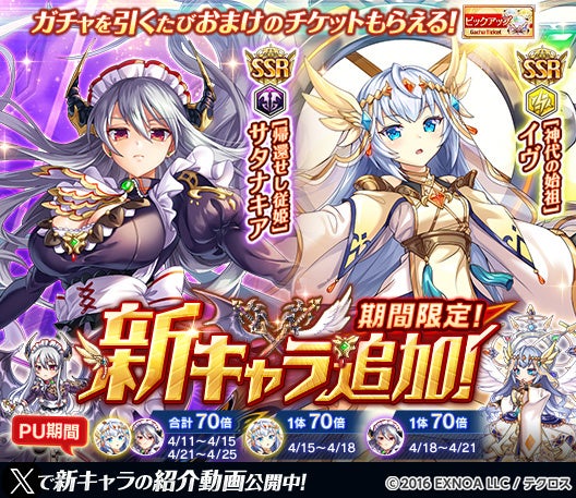 『神姫PROJECT』にて、イヴ、サタナキアが新たな神姫として初登場!さらに毎日最高100連無料ガチャが当たるプレゼントルーレットを開催!