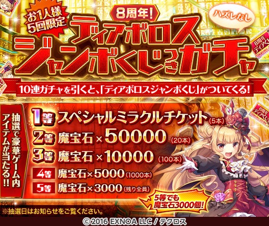プレミアムガチャ(10連)に、おまけとして「ディアボロスジャンボくじ(8周年)」1枚がつくガチャを開催します!