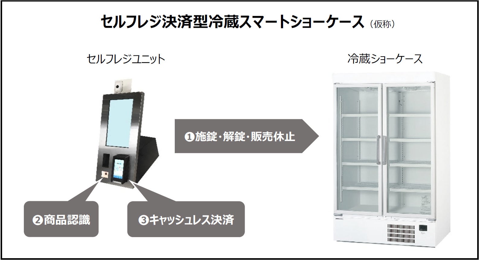 今回の実証実験で使用する「セルフレジ決済型冷蔵スマートショーケース(仮称)」は、冷蔵ショーケースとセルフレジユニットからなり、下記3つの仕組みにより無人販売サービスを実現しています。