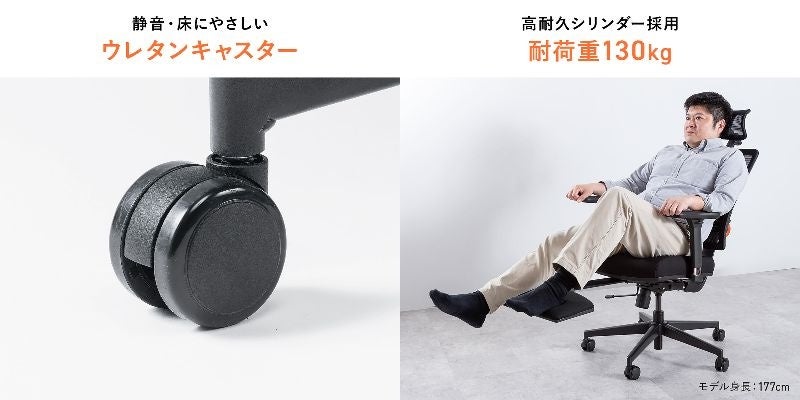 静音性が高く、床にやさしいウレタンキャスターを採用しています。高耐久クラス4のガスシリンダーを搭載しており耐荷重は130kgです。