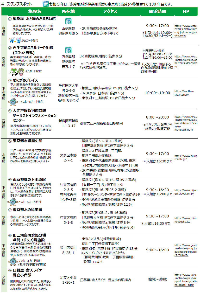 を、③ぜにがめプレイス及び⑥東京都虹の下水道館では「マンホールカード」を配付しています。デジタルス