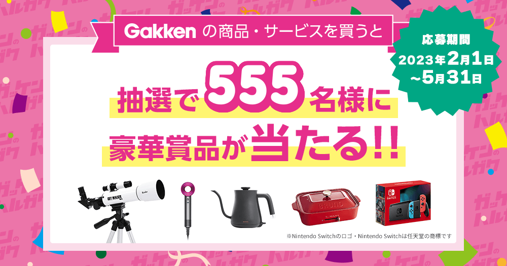 対象期間中に、「中学ひとつひとつわかりやすく。」シリーズを含む本や雑誌、学研教室、オンラインサービスなど、Gakkenの商品・サービスを購入しWEBからご応募いただくと、抽選で555名に人気の家電や選べる電子マネーギフトをプレゼントいたします。この機会に、ぜひご参加ください!