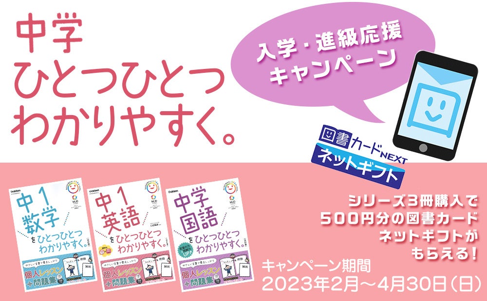 「中学ひとつひとつわかりやすく。」シリーズ対象商品を3冊ご購入のうえ、商品とご購入したレシートの画像を送付していただいた方に、500円分の図書カードネットギフトを差し上げます! 3,000円相当のご購入で500円が戻ってくる、たいへんお得なキャンペーンです。