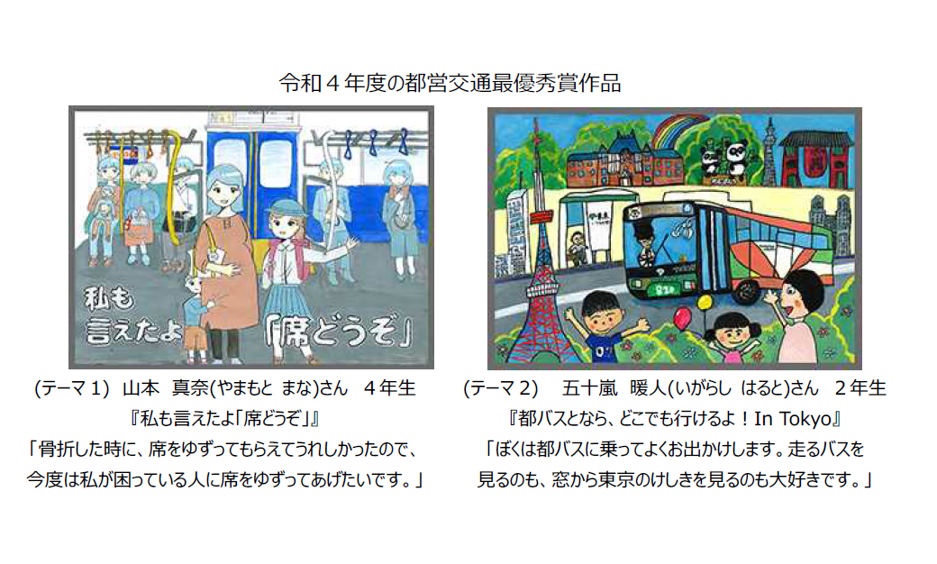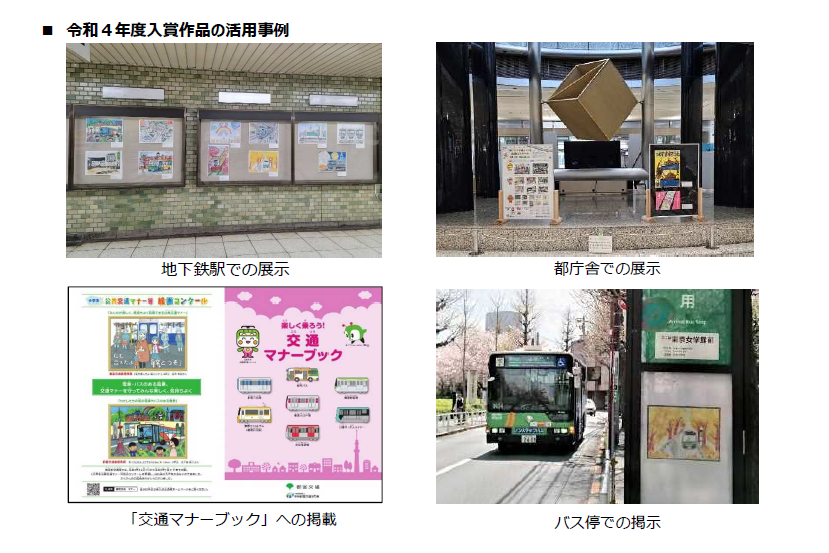 入賞作品は、都営地下鉄駅構内等への展示や交通局公式ホームページでの紹介、交通局発行の「交通マナーブック」への掲載など、普及啓発のために使用いたします。