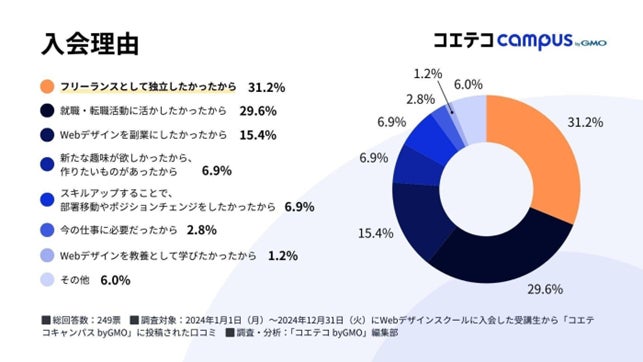 受講者がWebデザインスクールに入会した理由を見ると、最も多い回答は「フリーランスとして独立したかったから」(31.2%)でした。