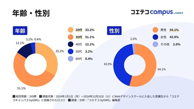 性別は、女性43.9%と男性54.1%であり、プログラミングスクールでは女性が49.6%、男性が48.7%とほぼ均等であるのに対し、Webデザイン分野では男性がやや多い傾向が見られます。