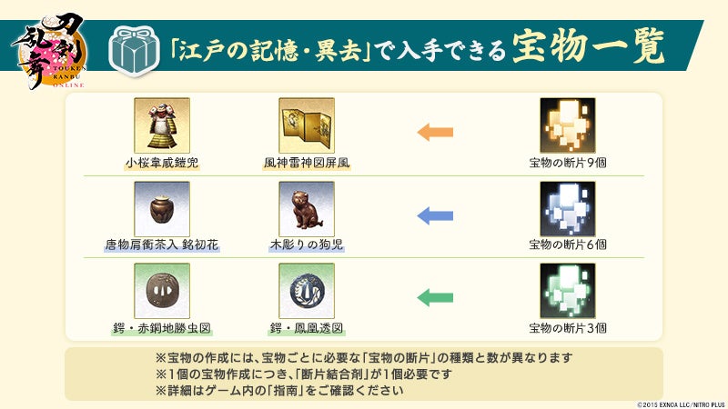 2024年4月23日(火)メンテナンス後より、新たなる出陣先「江戸の記憶・異去」を実装いたしました。戦闘に勝利するとまれに「宝物(ほうもつ)」の作成に必要な「宝物の断片」を入手できます。