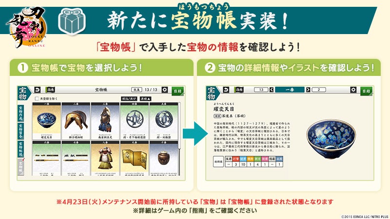 新たに「宝物」を6点追加いたしました。「宝物」は「異去」へ出陣し、敵との戦闘に勝利すると入手できる「宝物の破片」で作成することができます。