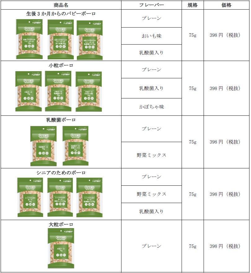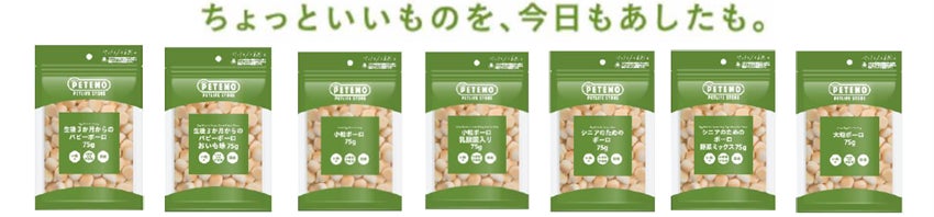 こうした需要を踏まえ、この度「PETEMO」のおやつシリーズより、新たに「ボーロシリーズ」の販売を開始します。「PETEMO」のおやつシリーズは、2019年の販売開始以来、商品ジャンルをガムやジャーキー、海産物やフリーズドライへと種類を拡大してまいりました。この度の「ボーロシリーズ」の新発売により、「PETEMO」のおやつシリーズの商品数は累計100 種類を達成します。