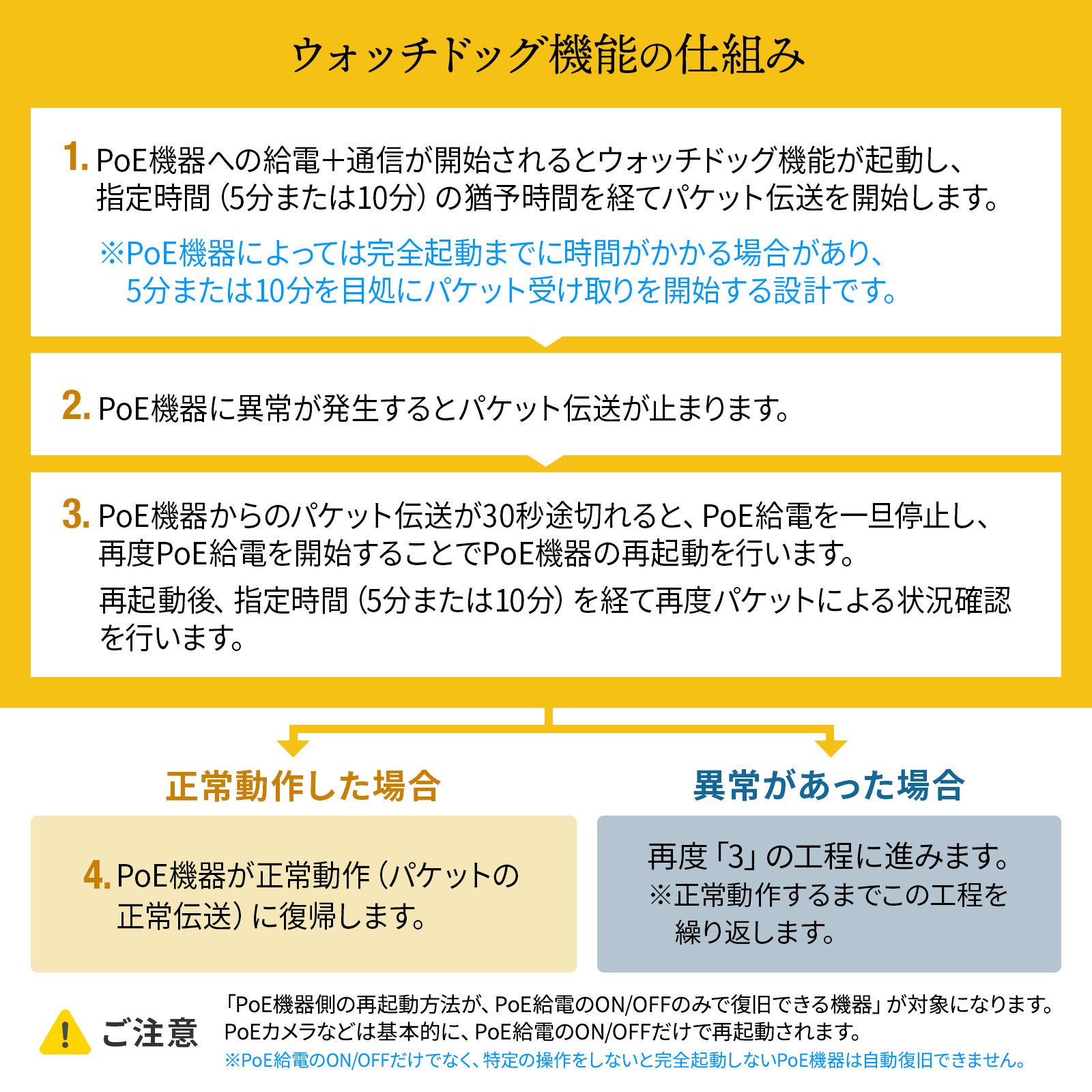 接続されたPoE機器の状態を30秒ごとに確認し、エラー発生時にはPoE給電のON/OFF(リスタート)をすることでPoE機器の再起動を促し復旧作業を自動化させることができます。