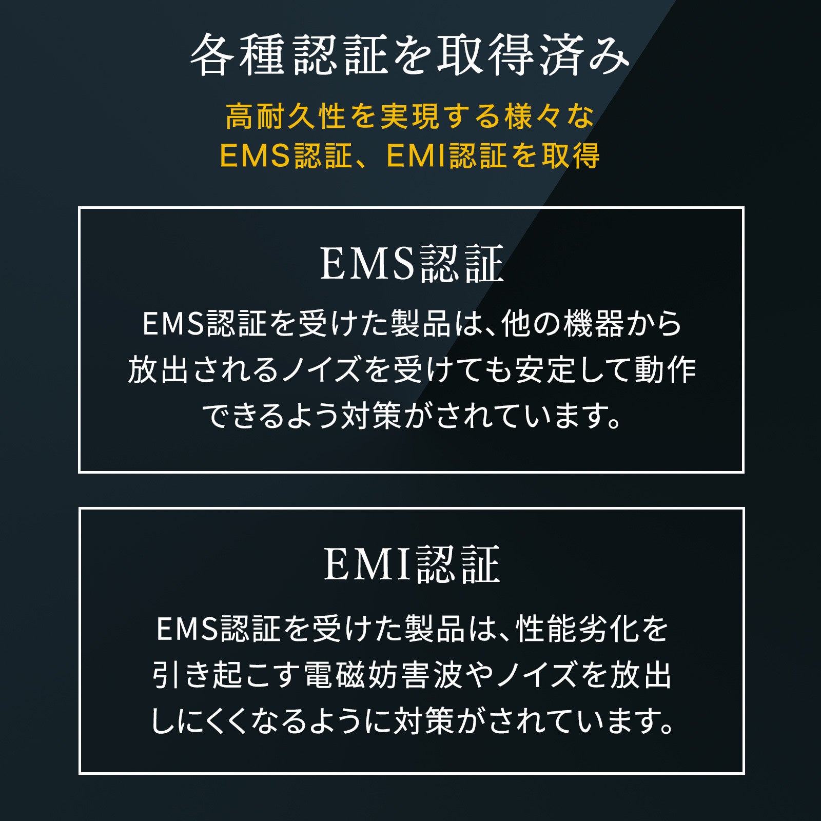 高耐久性を実現する様々なEMS認証、EMI認証を取得しています。