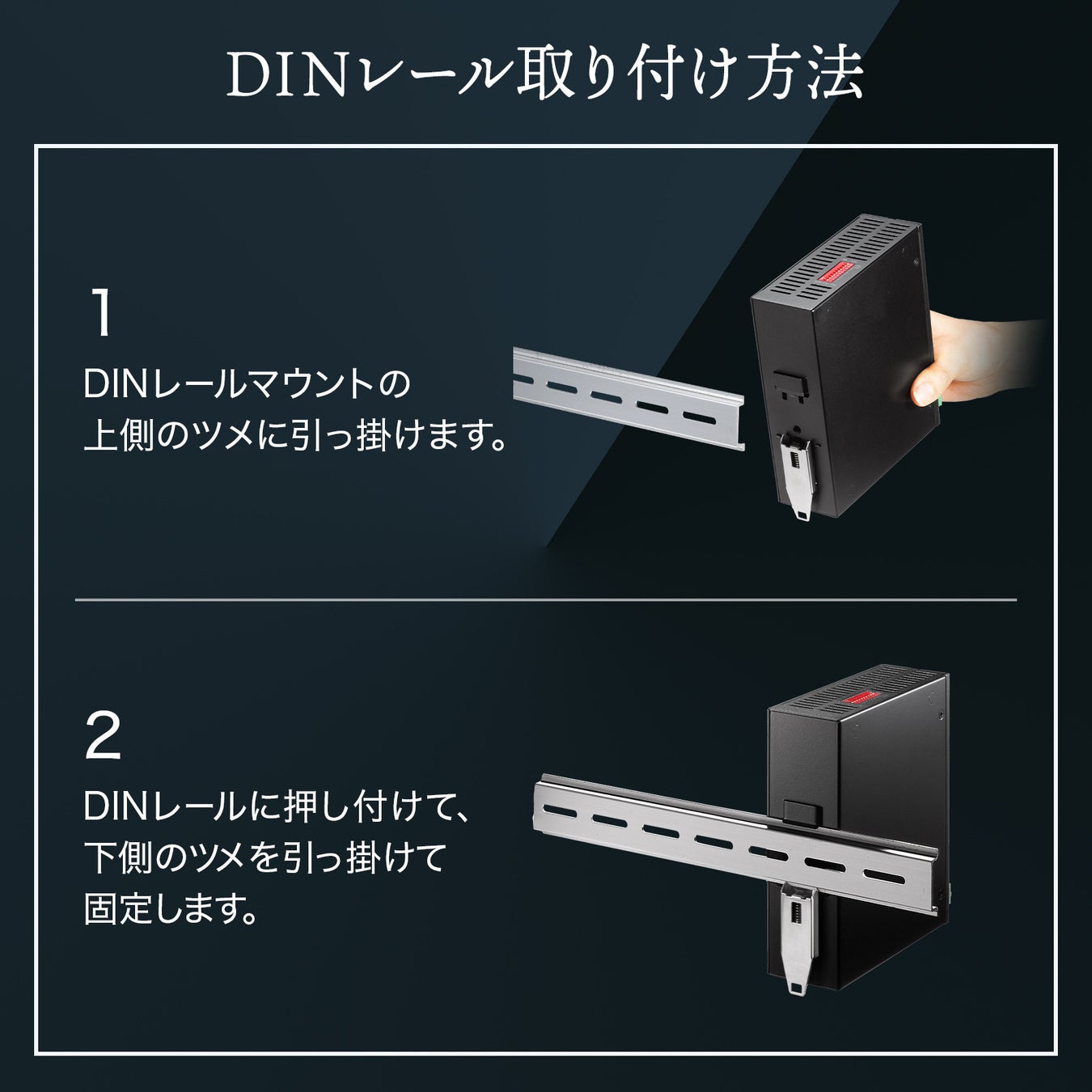 本体にDINレールマウントが取り付けられているので、DINレールに引っ掛けて固定するだけで使用できます。