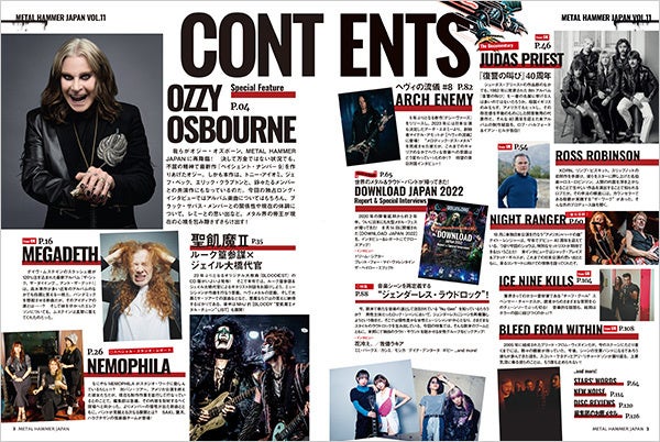英国の老舗ヘヴィメタル雑誌『METAL HAMMER』の日本版となる『METAL HAMMER JAPAN』は、欧米の最新トレンドと日本独自記事を融合させた、ハイブリッドなメタル&ラウド・ミュージック総合誌。Vol.11となる最新号では“ヘヴィメタル界の帝王”オジー・オズボーンを表紙・巻頭に、以降もメガデスやDOWNLOAD JAPANなど洋楽から、聖飢魔ⅡやNEMOPHILAといった邦楽まで幅広いハード・サウンドをピックアップ!
