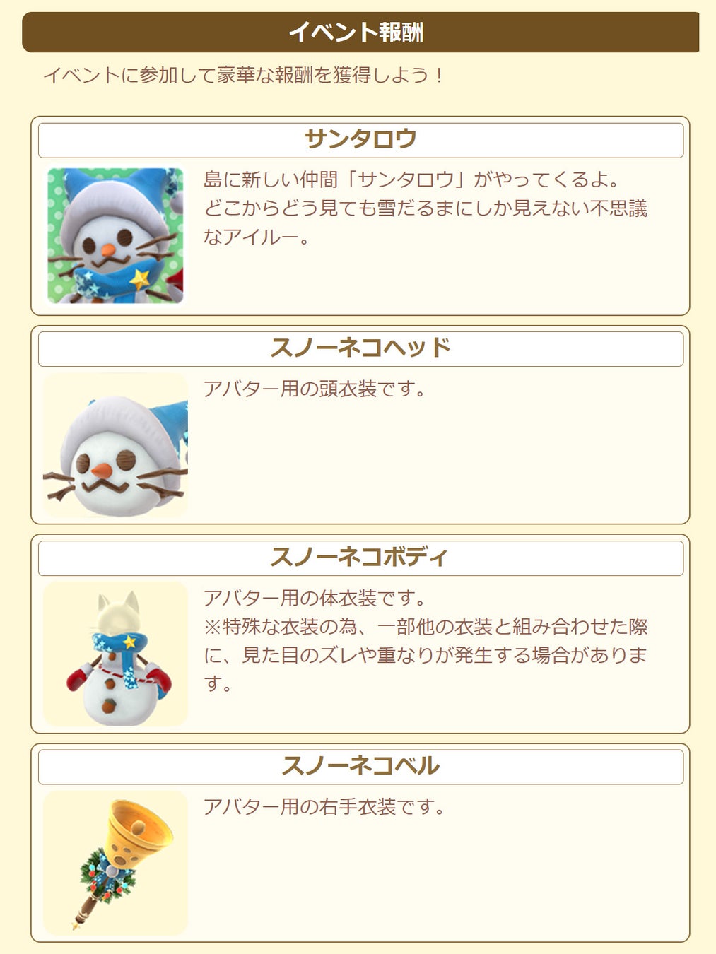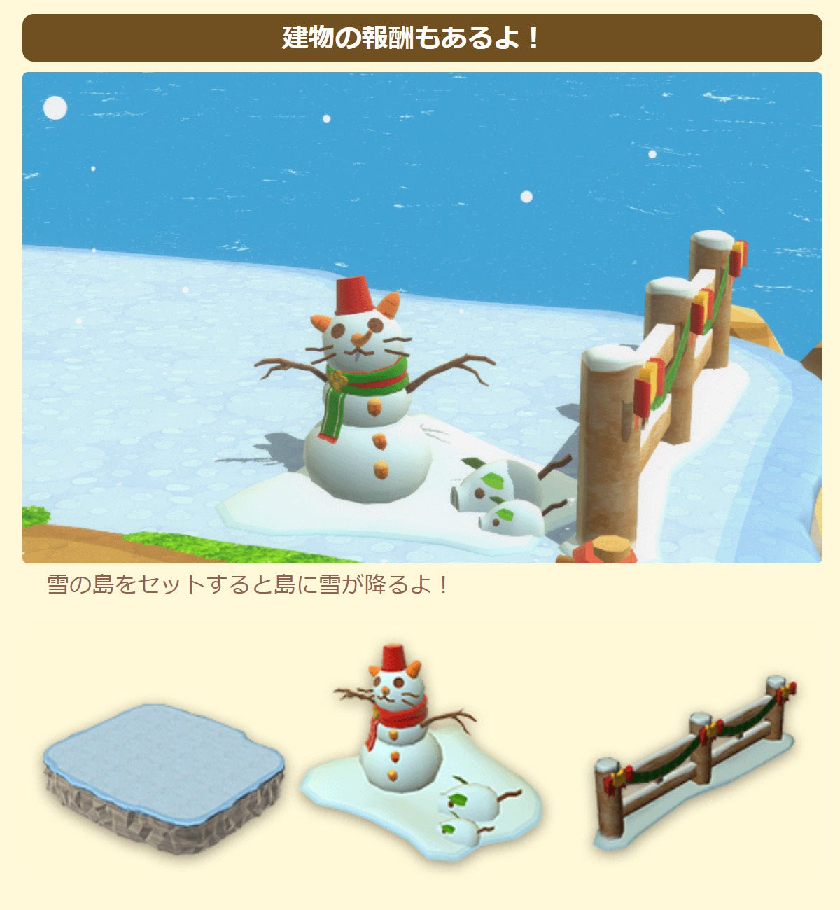 さらに「スノーネコヘッド」などのアバター用衣装や、セットすると島に雪が降る建物などの豪華報酬も手に入れよう!
