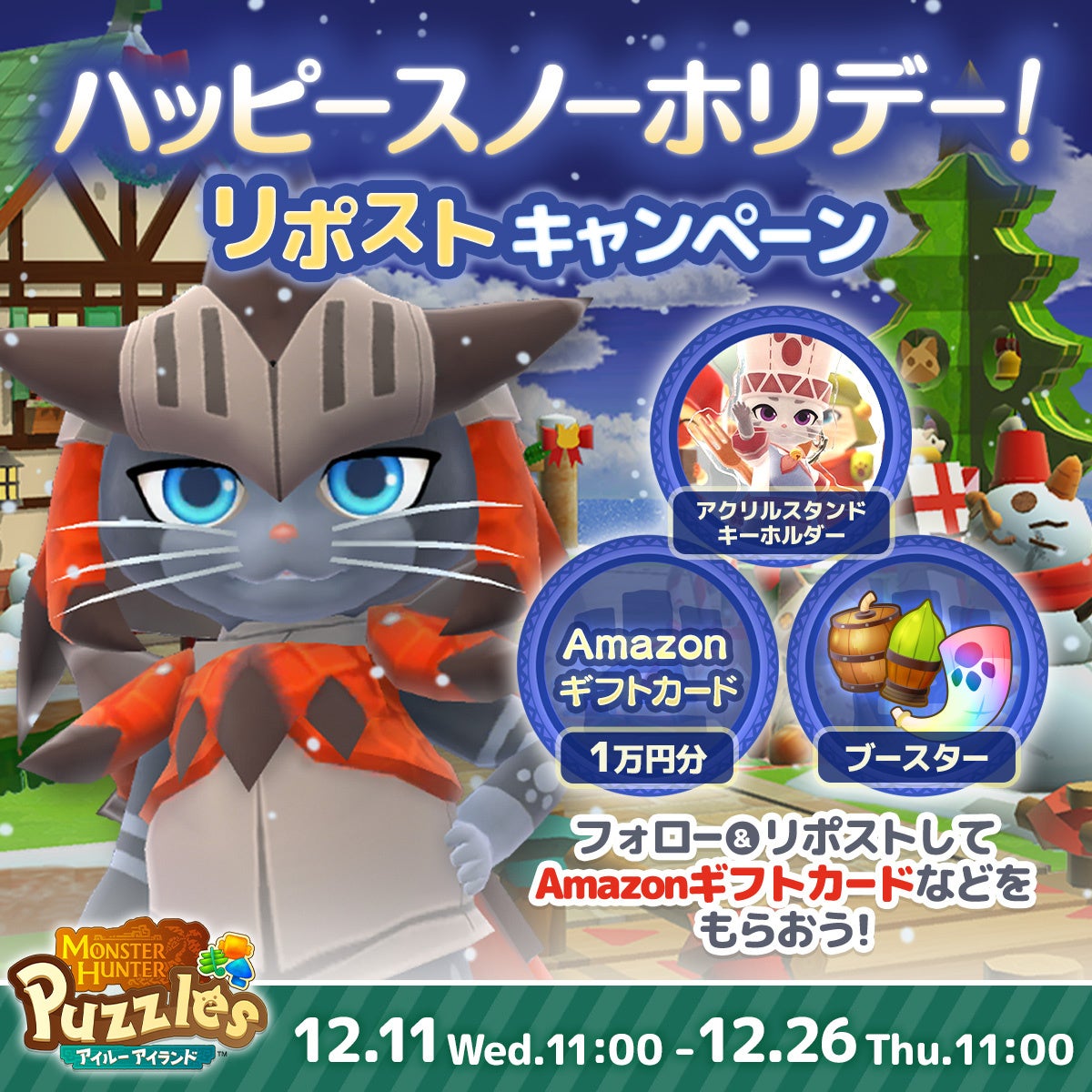 「モンスターハンターパズル アイルーアイランド」公式X (@MHPuzzles)をフォローし、 キャンペーン期間中に指定されたポストをリポストした方から抽選で10名様に1万円分のAmazonギフトカード(デジタルギフト)、抽選で10名様にアイルーアイランド トレーディングアクリルスタンドキーホルダーをプレゼントいたします。