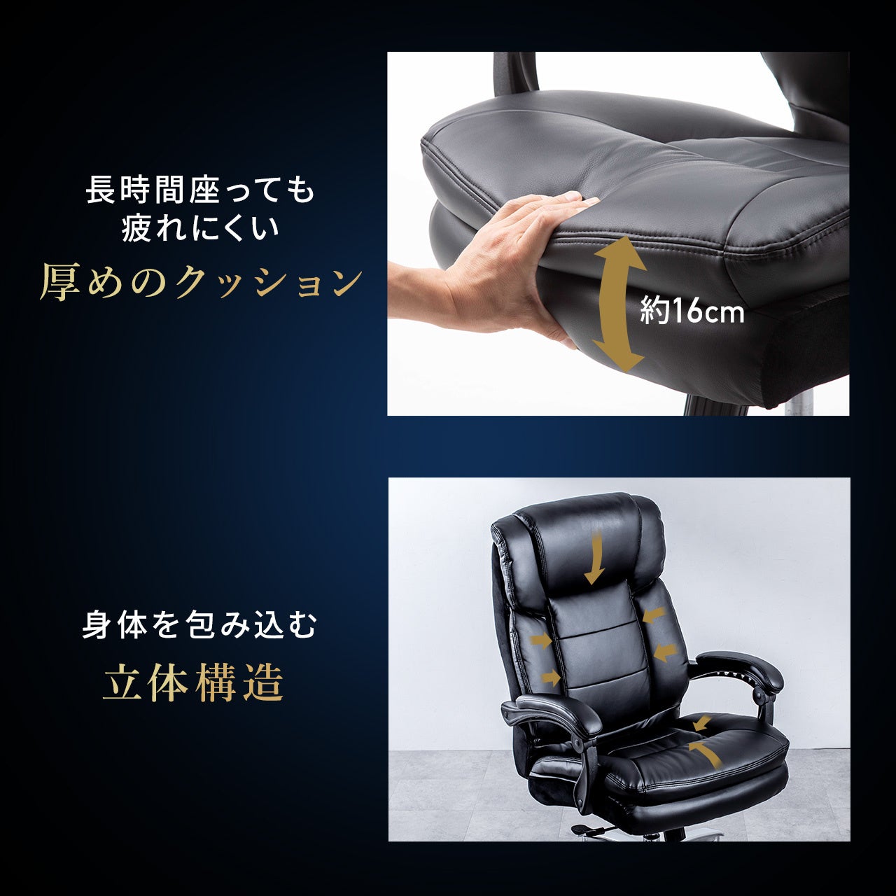 長時間座っても疲れにくい厚めのクッション、安心感のあるハイバック背面の仕様になっています。