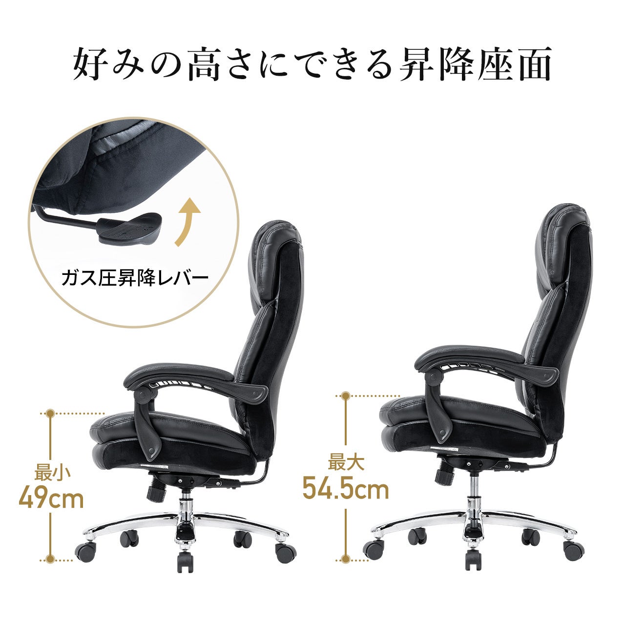 ガス圧昇降レバーを引くことで、お好みの座面高さに調整ができます。