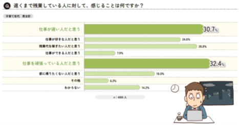 ○残業をしている人に対しては、頑張っていることを労いつつも「仕事が遅い人だと思う」「残業代を稼ぎたい人だと思う」といったネガティブな意見も。残業は、必ずしも良い評価にはつながらない(P13)