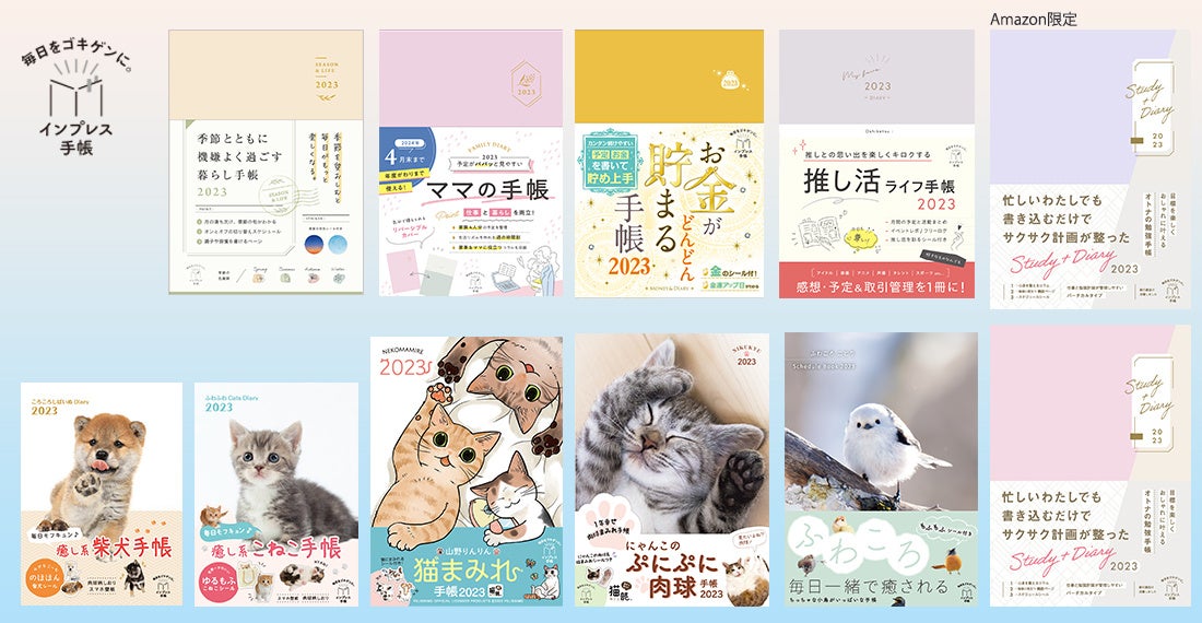 インプレス手帳は、「毎日をゴキゲンに。ステキな日常を叶える手帳」をコンセプトにしたシリーズです。「猫」「柴犬」「ことり」の写真に癒される動物手帳や、「お金管理」「家族の予定管理」「勉強計画」など暮らしに役立つ機能をもった手帳があり、個性的なデザインや機能を求めるユーザーから好評を博しています。