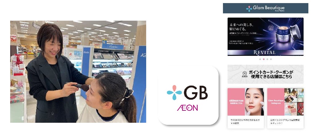 カウンセリングやメイクアップサービスなどの接客に加え、自社の専用アプリ「Glam Beautique from AEON」の肌測定機能などを活用し、コンサルティングサービスを提供します。アプリでは、購入履歴の確認やポイント付与、クーポン配信のサービスもあります。