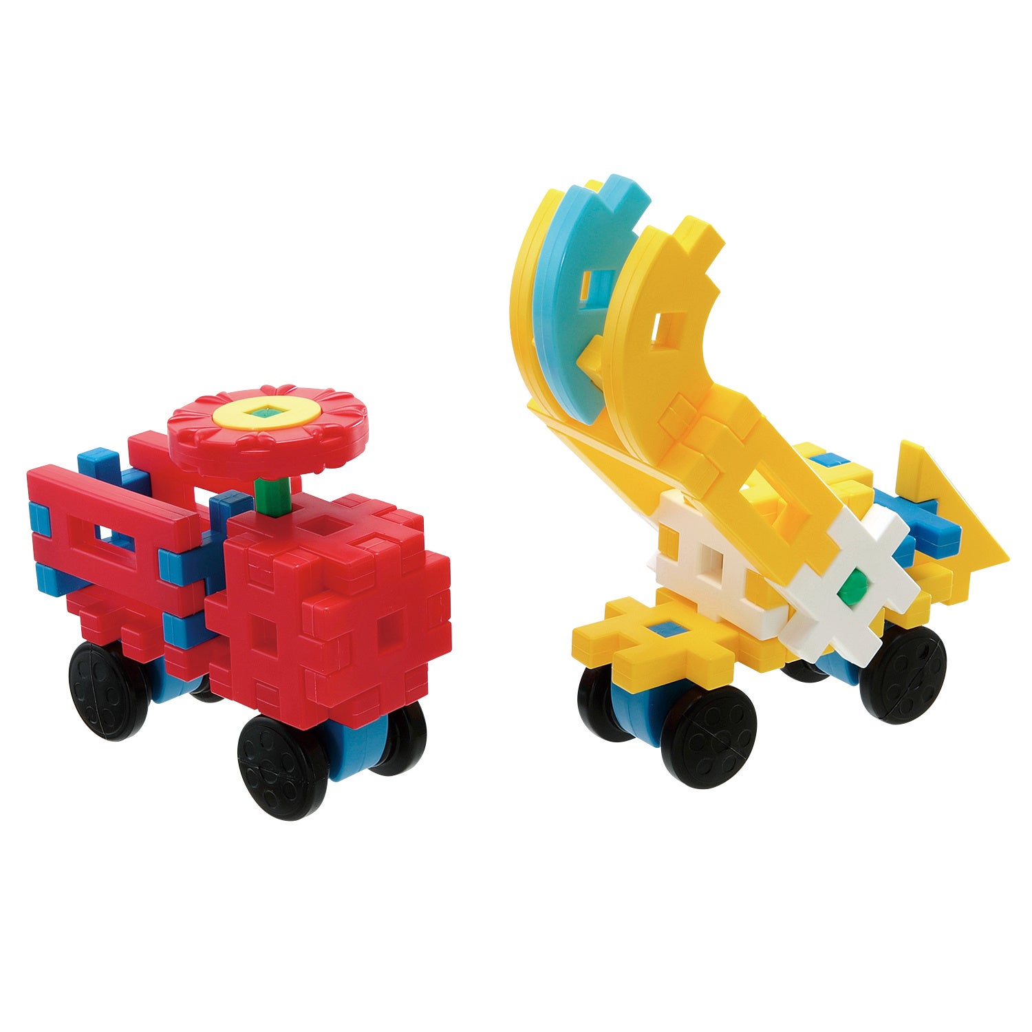 また、パーツが大きいため、1.5歳からお使いいただいても誤飲の心配がなく、お子さまのファーストブロックにぴったりです。最初は積む&こわす遊びからスタートし、食べ物や線路などに見立てる遊び、パーツを自由に組む遊び、そして頭の中で考えたものを作品にする遊びへと発展し、小学生になるまで長く遊んでいただけます。