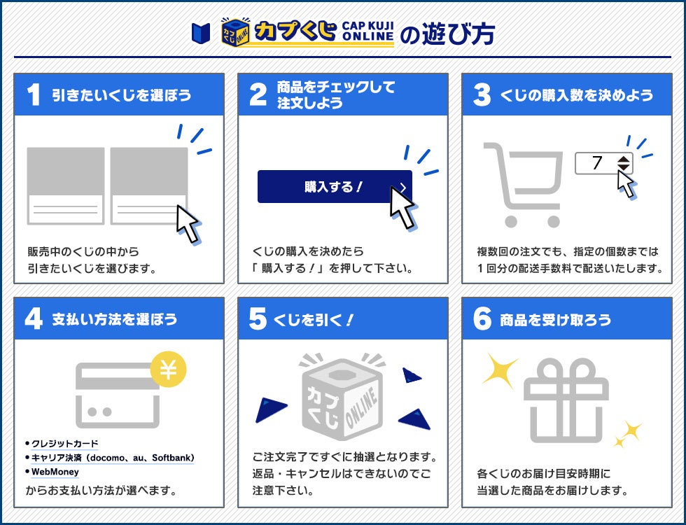 「カプくじオンライン」は、スマホ・PC等のWEBサイトからご利用いただける、「手軽に」「ハズレ無しで」「特別な商品が」「ご自宅まで直接届く」ハズレ無しのオンラインくじサービスです! カプコン限定の商品やオリジナルグッズなど、様々な企画をお届けいたします!