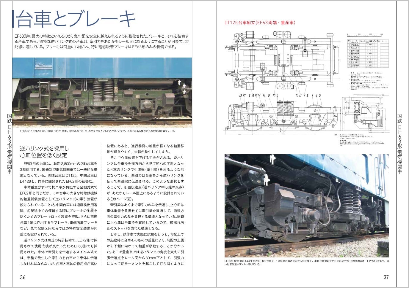 急勾配用のEF63形ならではの特殊装備、台車とブレーキは写真と図面資料を交えて詳しく解説しています。