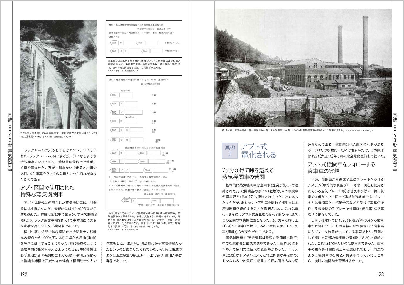 第3章では、アプト式時代の機関車を紹介。蒸気機関車から日本初の電気機関車まで、詳しく解説しています。