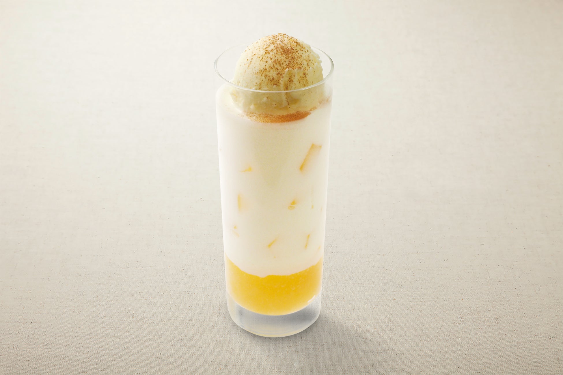 りんごソースに牛乳を注ぎ、バニラアイスにシナモンを振りかけた、りんごのシャキシャキ感がいいアクセントに!