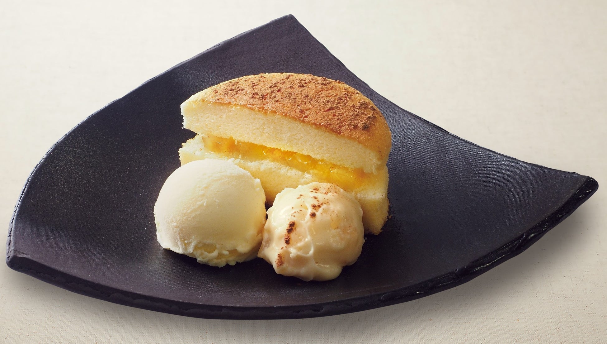 甘酸っぱいりんごソースをバターがしみ込んだスフレに挟み、一緒に添えたバニラアイスとりんごクリームで、味の変化をお愉しみください。